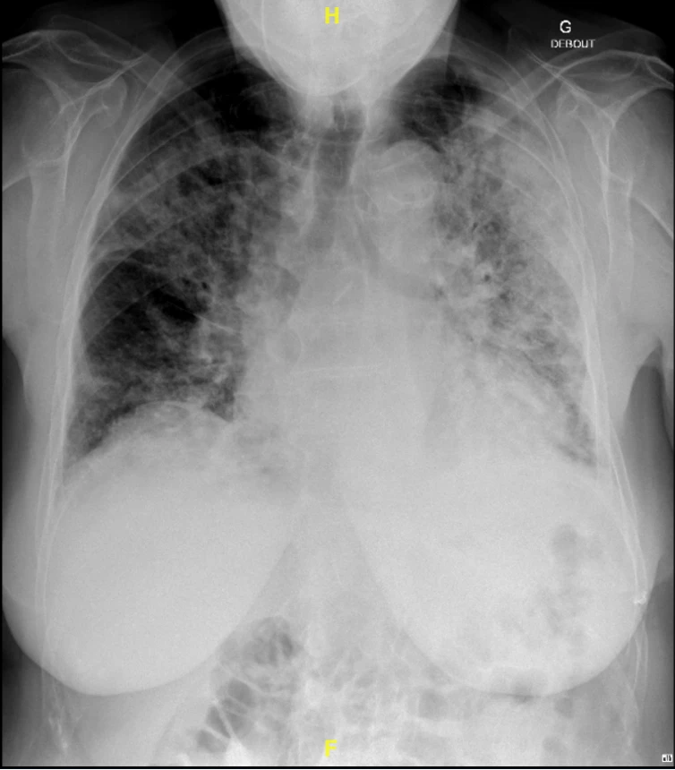 Madame Y est une patiente de 63 ans se présentant aux urgences pour dyspnée, toux et baisse de l’état général. L’examen clinique met en évidence une désaturation importante. La radiographie du thorax révèle un infiltrat alvéolaire panlobaire gauche avec un bronchogramme aérique. Les antigènes urinaires sont positifs pour une légionnelle. Face à un syndrome de détresse respiratoire aigu la patiente est intubée. Son évolution est favorable sous Levofloxacine.