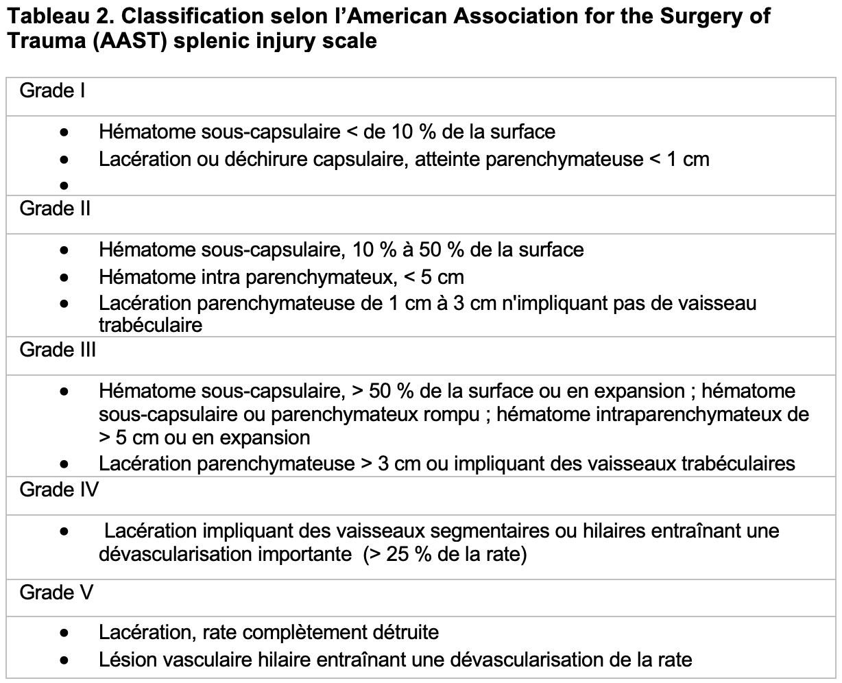 Le rapport du CT thoraco-abdominal fait état de lacérations post-traumatiques spléniques étendues classées grade IV selon AAST (cf tableau 2), atteignant le hile splénique, associées à un probable hématome sous capsulaire splénique médial et un saignement actif veineux au sein de lacération, un hémopéritoine abondant de localisation péri hépatique, péri splénique ainsi que dans le petit bassin et du liquide libre de densité hématique au sein de la gouttière pariéto-colique gauche.
