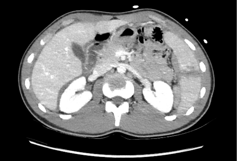 À l’examen clinique, le patient est hémodynamiquement compensé et présente un abdomen diffusément douloureux, sans défense ou détente ainsi qu’une loge rénale gauche douloureuse.