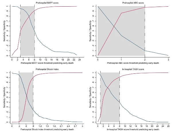 Dans cette même étude, l’approche en zone grise permet de différencier chacune des zones du score : la zone de rule-out (avec une sensibilité maximale) et la zone de rule-in (avec une spécificité maximale). La zone intermédiaire est dite zone grise (2). Pour chacune de ces zones, il convient de s’assurer que pour le paramètre à maximiser, l’autre paramètre ne soit pas trop faible. Par exemple, pour le triage des trauma sévère, l’American College of Surgeon fixe le seuil maximal d’undertriage (taux de faux négatif) à 5% et le seuil maximal d’overtriage (taux de faux positif) à 50%. L’undertriage (taux de faux négatif) correspond à 1-Se et l’overtriage (taux de faux positif) à 1-Sp. Dans le cas du BATT, pour un score à 3, on obtient une Se à 96% (soit 4% d’undertriage) avec une spécificité à 51% (soit 49% d’overtriage). Ce score permet de faire un rule-in sûr, sans provoquer un sur-triage trop important. Les autres scores présentés dans ce papier n’arrivent pas à accomplir ses performances, malgré des valeurs AUROC plus ou moins satisfaisantes.