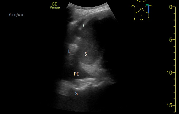 Une échographie pleuro-pulmonaire ciblée est effectuée. On visualise cette image en région thoracique latéro-postéro-basale gauche :