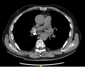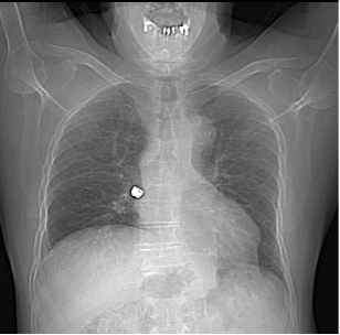 Le CT-scan thoracique, dont on voit ici le scout, met en évidence une structure hyperdense, de densité métallique, au sein de la bronche intermédiaire droite, pouvant correspondre à une couronne dentaire métallique, sans signe d’occlusion complète de la bronche. L’évolution est favorable après récupération de la dent logée dans la bronche intermédiaire droite par bronchoscopie.