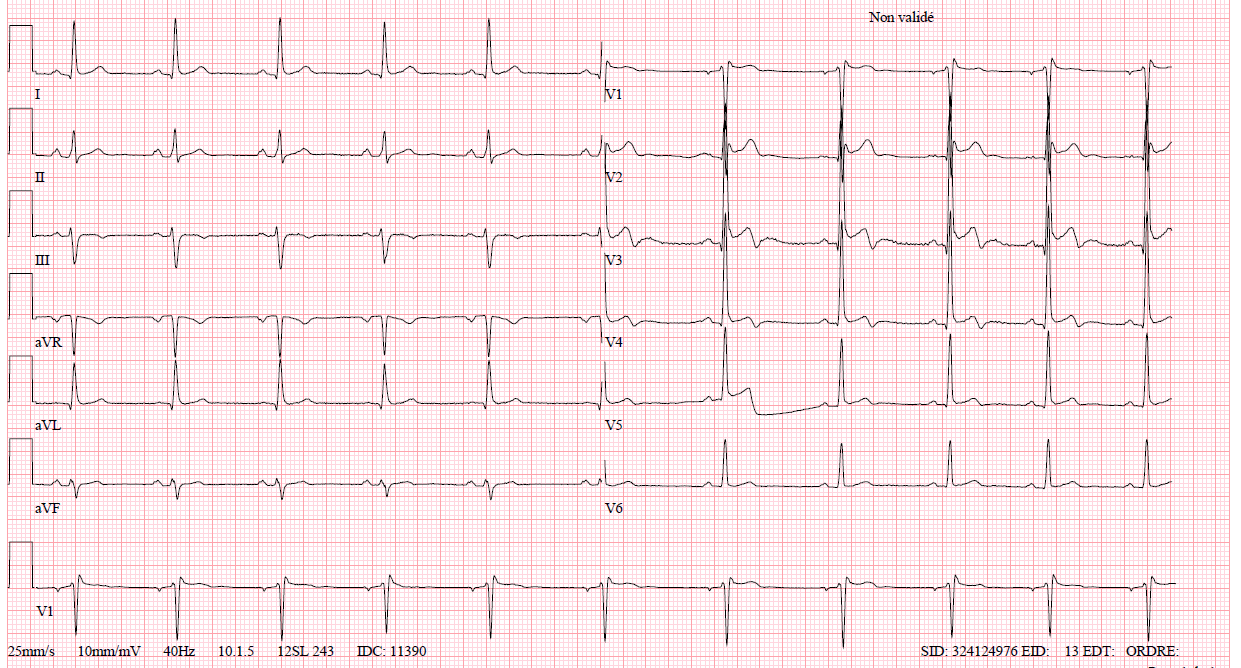 Les modifications électrocardiographiques typique sont un pattern Brugada type I avec une élévation du point J et du segment ST de ≥ 2 mm en dôme ou « coved-type » suivi d’une onde T négative dans les dérivations précordiales droites (V1 à V3), ou un pattern Brugada type II comme sur l’image présentée avec des ondulations spécifiques dans la dérivation V2 ou V1 de l'ECG, souvent décrites comme un aspect de "selle de cheval" ou « saddle back ». Le point J est sus-décalé d’au moins 2 mm, et le ST d’au moins 1 mm.