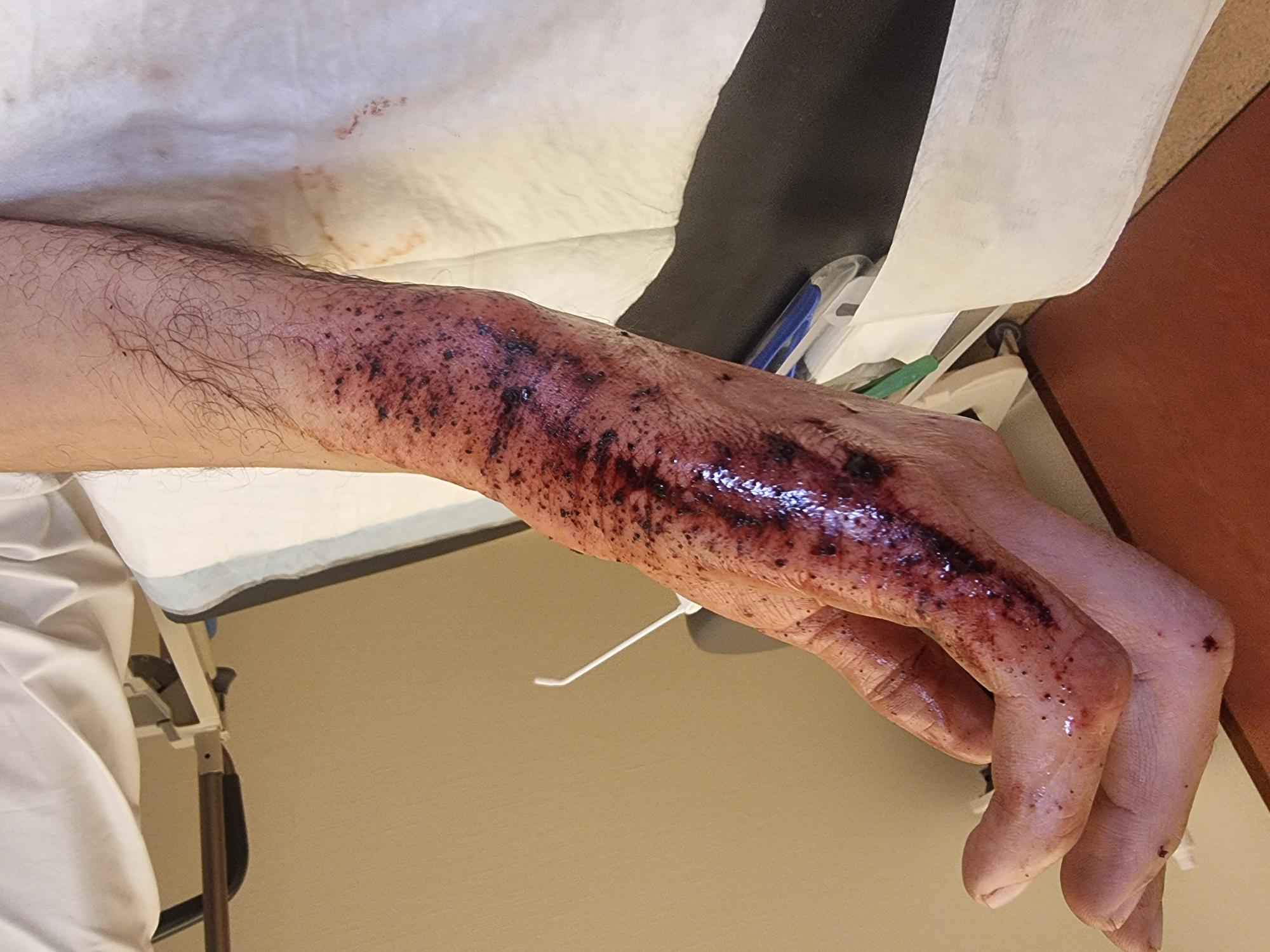 La décontamination par le personnel protégé sera suivie d’une irrigation abondante à l'eau. Un débridement chirurgical peut s’avérer nécessaire dans environ un tiers des cas. Ce patient, suivi à la consultation des plaies, a eu une évolution favorable. Ce cas souligne l'importance d'une reconnaissance appropriée et d'une décontamination précoce des brûlures liées au ciment.