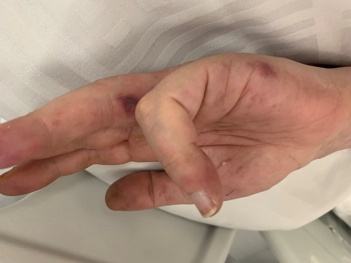 Voussure au niveau sous-clavier gauche avec collection sous-cutanée palpable. Présence de multiples lésions au niveau de la main gauche, sans changement notoire à la vitropression et indolore (cf. image).