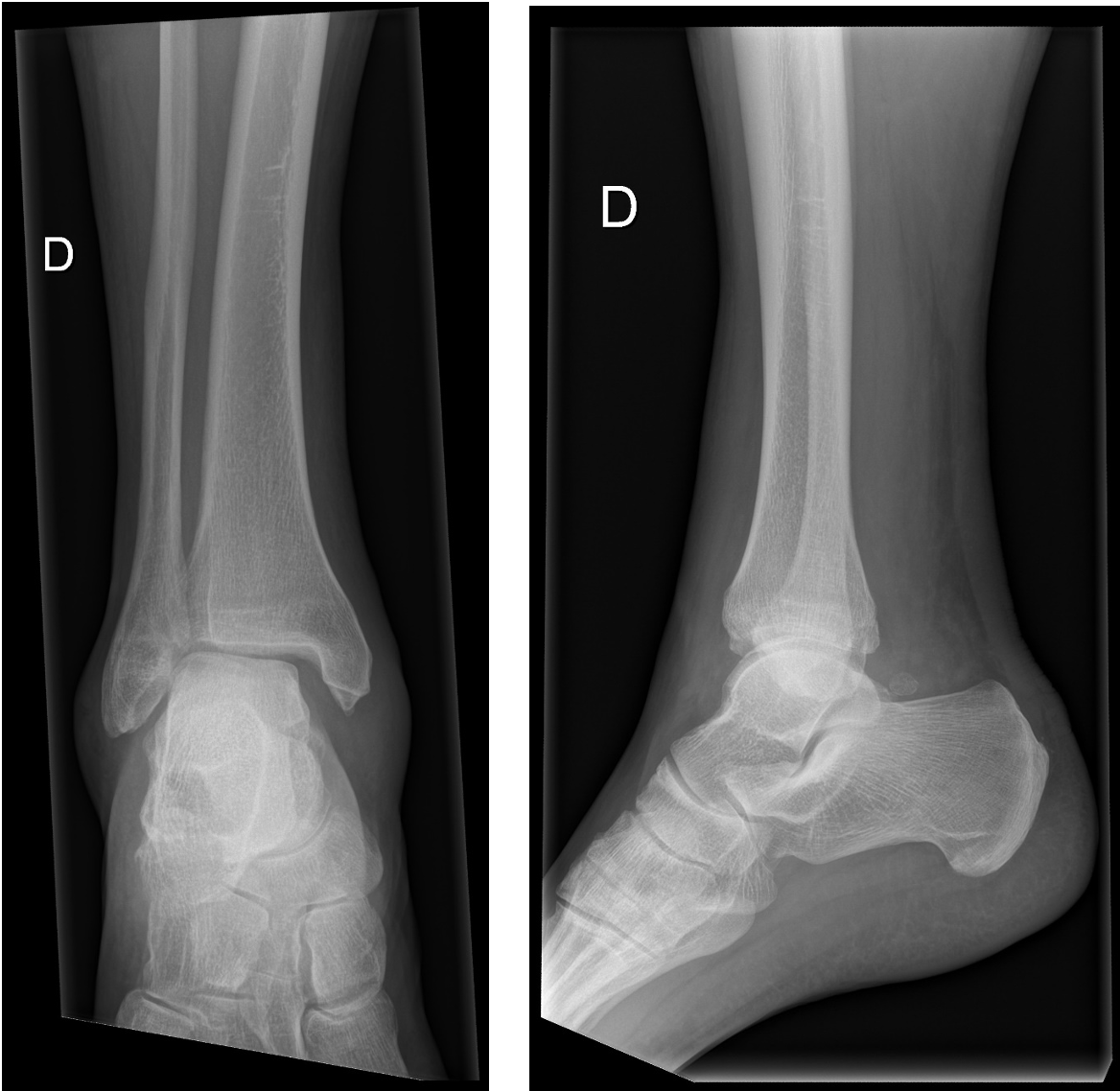 Tu effectues des radiographies face et profil de la cheville droite :