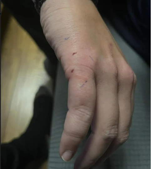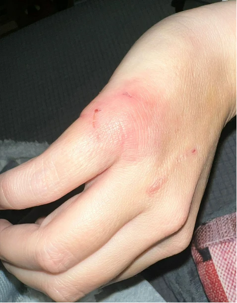 L’érythème remonte le long du 5ème métacarpien jusqu’au poignet et commence à se propager sur le dos de la main.