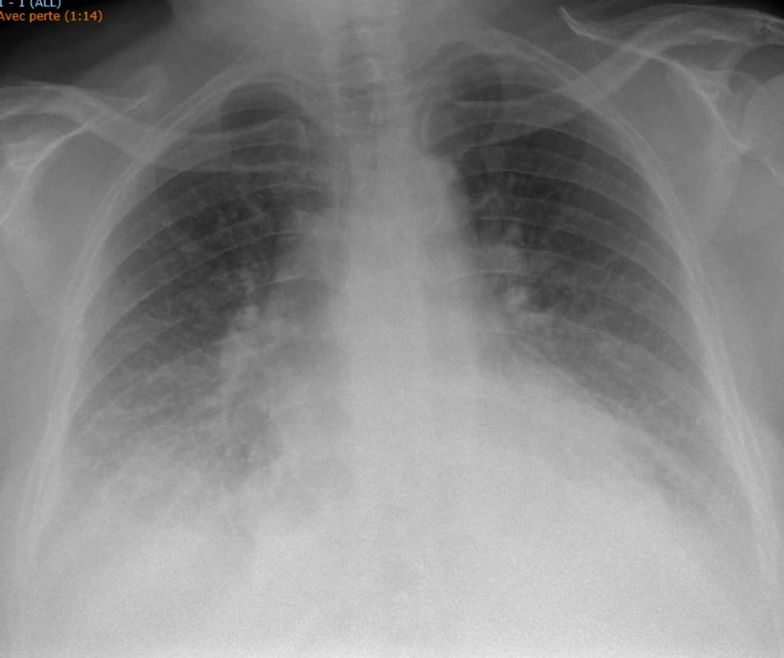 Une patiente de 70 ans connue pour une obésité et traitée pour un diabète sans insuline, consulte les urgences pour une dyspnée d’effort d’apparition progressive depuis quelques semaines, avec nette péjoration depuis 3 jours (actuellement NYHAIV). Elle décrit également une orthopnée nouvelle sans dyspnée paroxystique nocturne. Pas de douleurs thoraciques, pas de toux, pas de fièvre, pas de facteurs de risque thrombo-emboliques rapportés. Paramètres vitaux à l’arrivée : FC 70/min, TA 135/75mmHg, FR 13/min, Saturation 94% sous 2L d’oxygène, T° 36.6. L’examen clinique met en évidence une patiente obèse, avec diminution du murmure respiratoire aux bases des deux côtés, pas de bruits surajoutés, et des œdèmes des membres inférieurs légers. Les mollets sont souples et indolore sans signes cliniques de TVP.Le laboratoire est sans particularité (Na, K, créat, CRP, FSS), tout comme l’ECG. Le NT-proBNP est normal (< 200 ng/l).