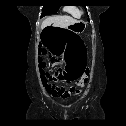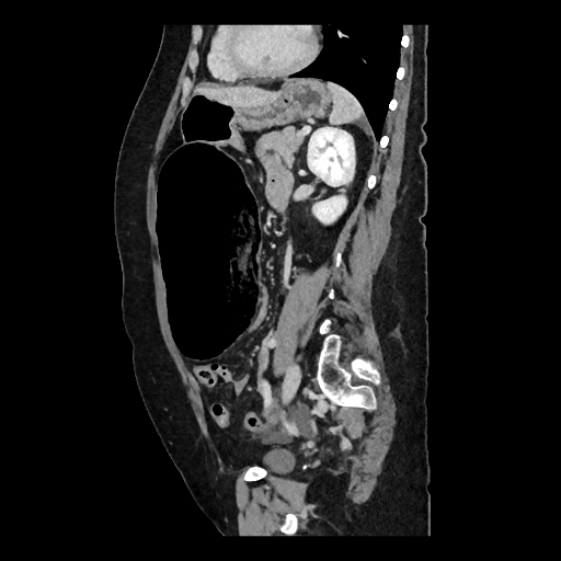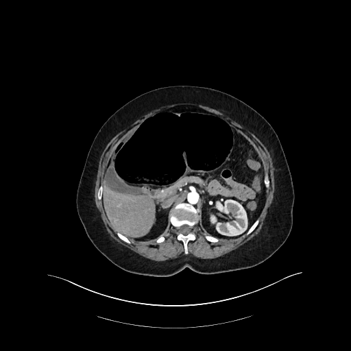 Une patiente de 59 ans, avec antécédents de lithiases vésiculaires, se présente aux urgences pour une douleur abdominale diffuse à type de colique, d'apparition brutale depuis la veille au soir. La douleur est d'intensité 8/10, sans position antalgique ni caractère transfixiant. La patiente signale que ces douleurs sont similaires à ses épisodes antérieurs de migration lithiasique biliaire. Le tableau clinique est également marqué par des nausées, six vomissements liquidiens et un vomissement biliaire à l'admission. La patiente note une inappétence ainsi qu'un épisode de selles liquides la veille. Ses antécédents chirurgicaux se limitent à une césarienne. A l'examen, la patiente est très inconfortable sans position antalgique, et afébrile (36,7°C). Les constantes vitales sont stables (TA 100/71 mm Hg, FC 83 bpm, FR 16 cycles/min, SpO2 95%). L'abdomen est souple, sensible en sus-pubien et épigastrique avec masse palpable sans défense ni détente. Les signes de Murphy et du psoas sont négatifs. Le bilan biologique révèle une légère hyperleucocytose (11,4 G/L) et une CRP à 6,8 mg/L, avec tests hépatiques normaux et des lactates à 1,2 mmol/L.