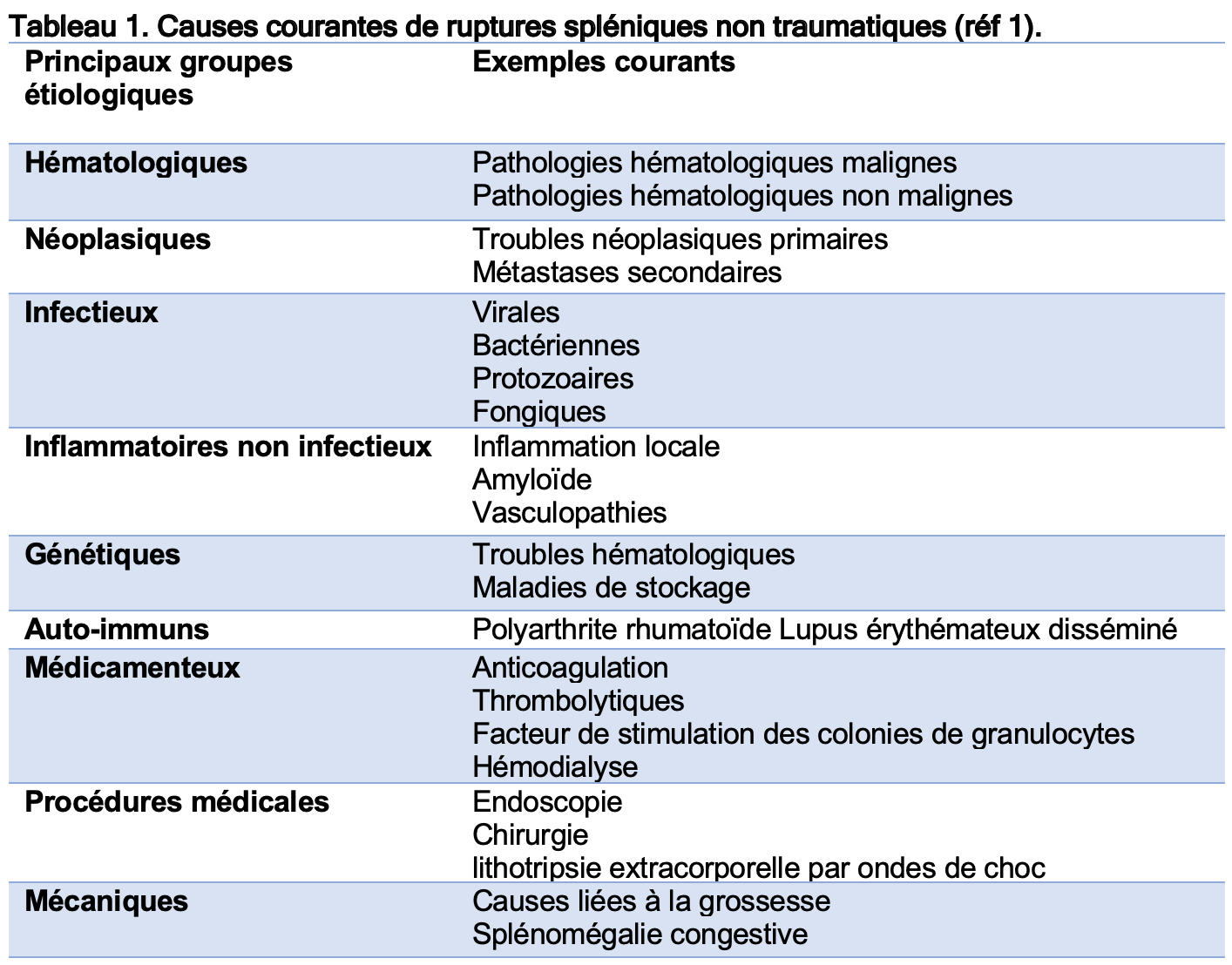 Les ruptures spléniques peuvent être divisées en deux catégories ; traumatiques ou non traumatiques. Parmi les causes traumatiques, le trauma direct et les chutes sont les causes les plus fréquentes. La rupture peut se présenter immédiatement après la chute ou après un délai. Les causes non traumatiques sont rares et d’étiologies variées (cf tableau 1.) L’échographie est un bon examen pour détecter du liquide libre (dès 100ml) avec une sensibilité de 90%, mais ne pourra pas formellement exclure une lésion splénique. Le CT-scanner reste l’examen de choix.