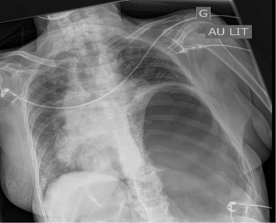 Elle bénéficie de ventilation assistée au ballon durant son transport au déchoquage. La radiographie de thorax au déchocage est la suivante.